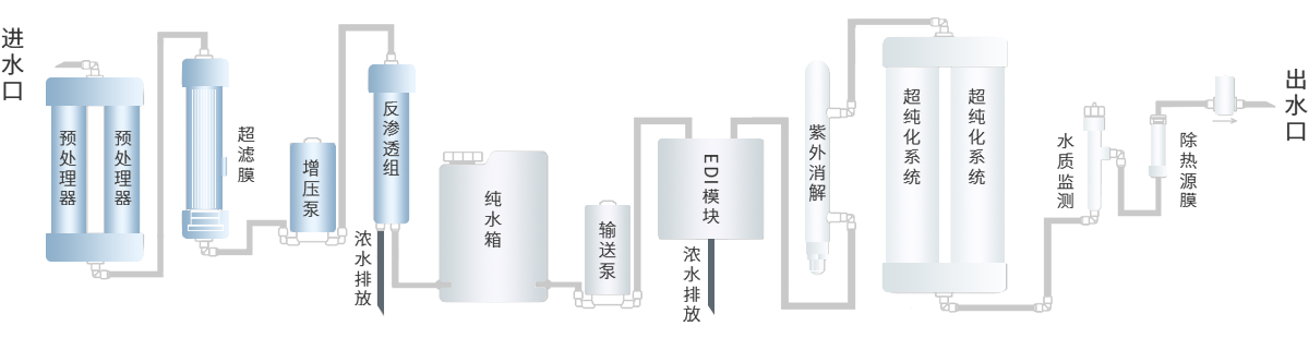 采用多級(jí)預(yù)處理器過濾,雙膜法及雙級(jí)反滲透工藝,進(jìn)口陶氏反滲透膜片,配備EDI電除鹽膜塊,更深層次去除水中離子,